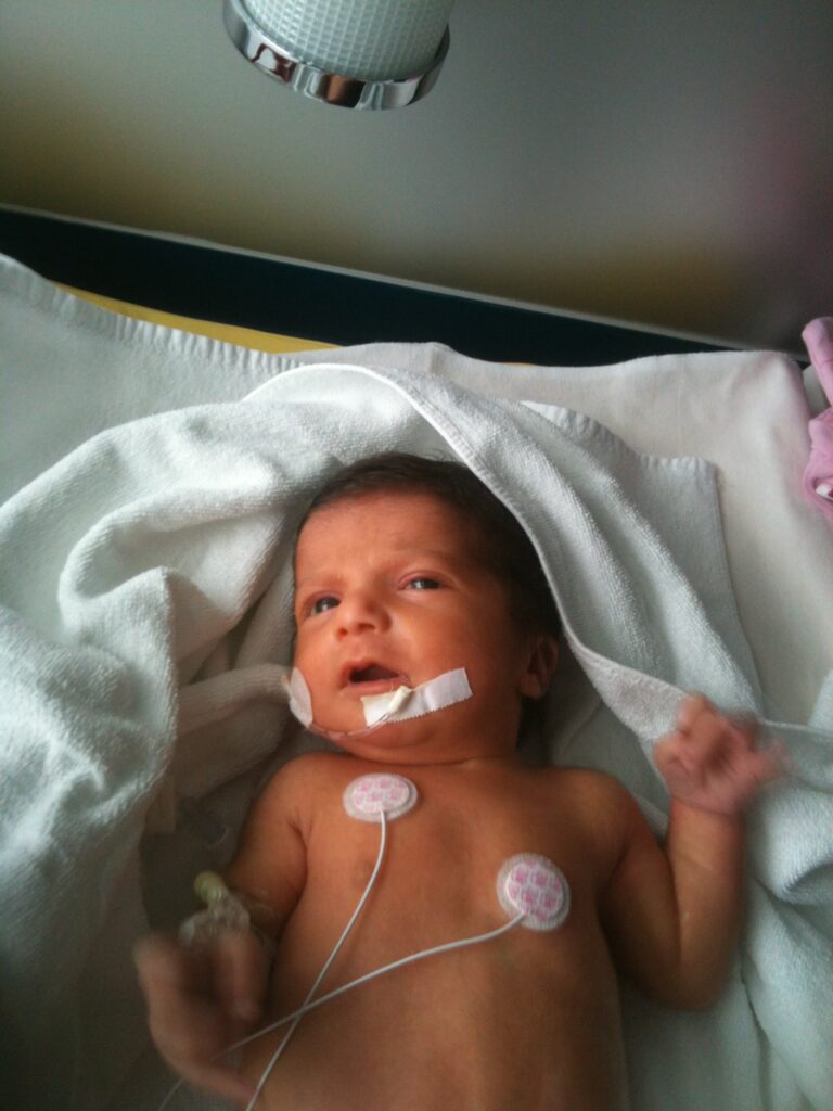 Notre petite est nourrie par une sonde nasogastrique (un petit tuyau dans le nez qui descend jusqu’à l’estomac), mais voilà… à chaque gavage, elle broncho-aspire (terme médical). Cela complique encore plus sa santé.